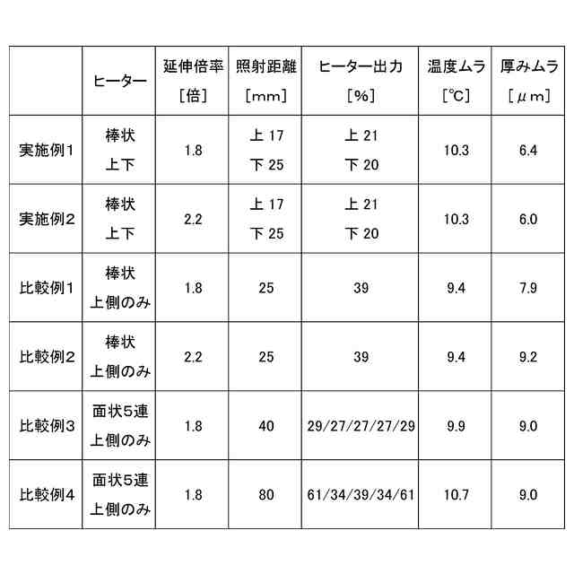 (1)本発明の一態様に係るフィルム延伸装置は、熱可塑性樹脂からなるフィルムを搬送しながら加熱延伸するフィルム延伸装置であって、前記フィルムを駆動する一対の駆動ロールと、前記一対の駆動ロールの間で前記フィルムが張架される一対の張架ロールと、前記一対の張架ロールの間の前記フィルムの全幅に亘って対向するよう前記フィルムの表裏に1本ずつ配設される棒状または帯状の一対の赤外線ヒーターと、を備え、前記一対の駆動ロールの間に前記赤外線ヒーター以外に熱源を有しない。
