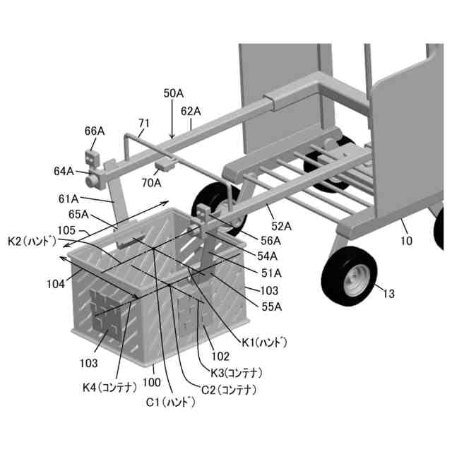 コンテナを捕獲する、左右のハンド(55A)とハンド(65A)の中心位置(C1)を通過する仮想線(K1)が、