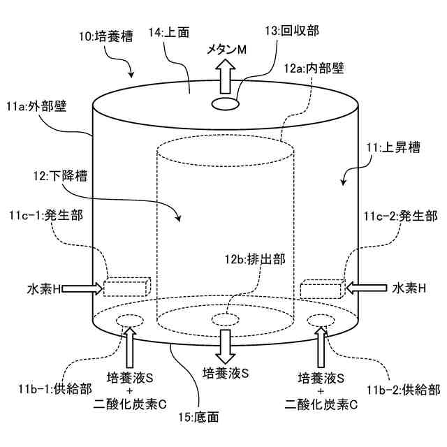 【解決手段】菌体培養槽10は、メタンMを生成するメタン生成菌を培養する培養液Sを上昇させる構造を有する上昇槽11と、上昇槽11から越流した培養液Sを下降させる構造を有する下降槽12と、上昇槽11および下降槽12の培養液Sから放出されたメタンMを回収する回収部13と、を備える。