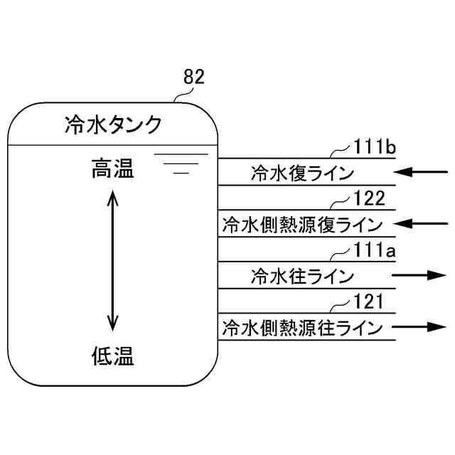前記冷却用熱媒体タンクの各ラインの接続位置は、上から下に向かって前記冷却用熱媒体復ライン、前記冷却用熱媒体側熱源復ライン、前記冷却用熱媒体往ライン、前記冷却用熱媒体側熱源往ライン、の順になるように設定される、