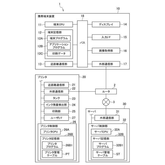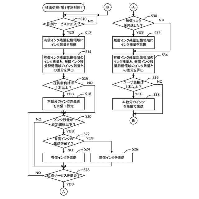 【解決手段】サーバCPU32Aは、プリンタ20が印刷サービスに加入する際のインク残量を示す第1値を特定し(S12)、印刷サービスを退会する際のインク残量を示す第2値を特定し(S32)、第1値と第2値との差分を決定し(S14,S34)、決定した差分に基づいて、印刷サービスを締結したプリンタ20のユーザと、印刷サービスによりサービスを提供したサービス提供者とのいずれかに、インクに係る費用を補填する(S18,S38)。