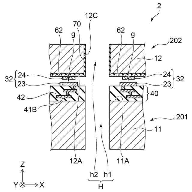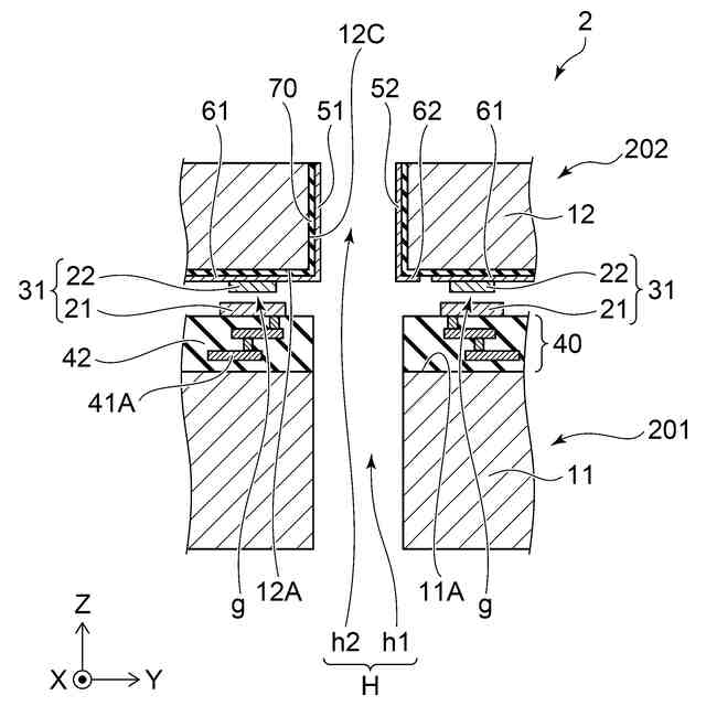図1に示すように、第1実施形態の電子デバイス1は、第1チップ101と、第2チップ102と、第1接続部31と、第2接続部32と、接合部90とを備える。複数の接合部90が第1チップ101と第2チップ102との間に設けられている。第1チップ101と第2チップ102とは、接合部90を介して互いに接合され、第1方向Zにおいて積層されている。なお、第1方向Zに直交する2方向を、第2方向X及び第3方向Yとする。第2方向Xと第3方向Yとは互いに直交する。