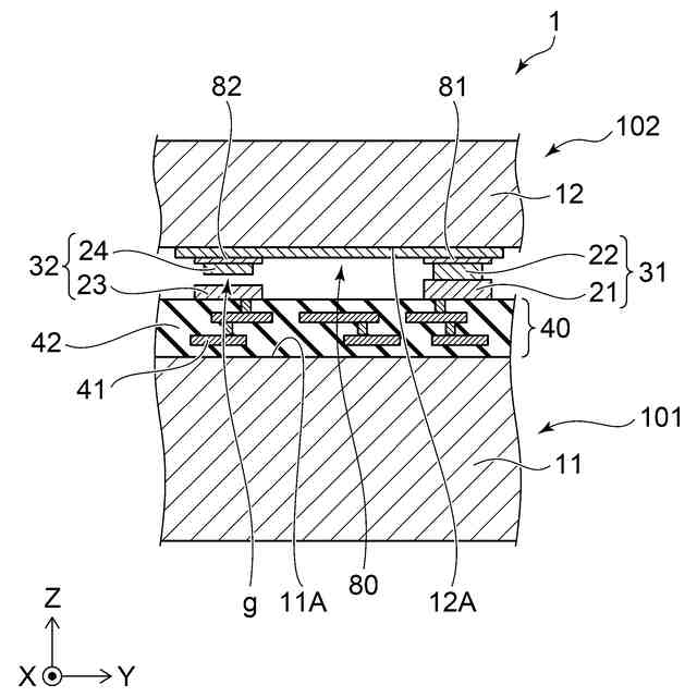 図1に示すように、第1実施形態の電子デバイス1は、第1チップ101と、第2チップ102と、第1接続部31と、第2接続部32とを備える。第1チップ101と第2チップ102とは、第1接続部31及び第2接続部32のうちの一方の接続部(図1に示す例では第1接続部31)を介して接合され、第1方向Zにおいて積層されている。なお、第1方向Zに直交する2方向を、第2方向X及び第3方向Yとする。第2方向Xと第3方向Yとは互いに直交する。