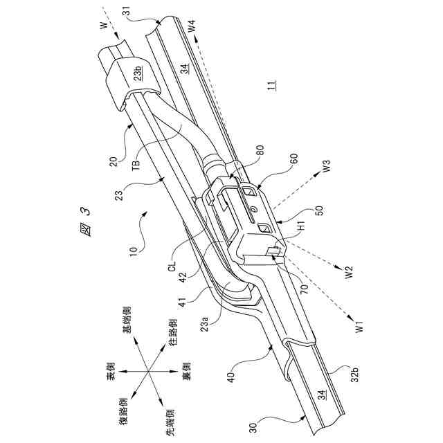 【解決手段】ワイパアーム20に装着される連結部材40と、連結部材40に装着されるブレードラバー32と、第2長辺壁部42に装着され、第1ウォッシャ液W1~第4ウォッシャ液W4を噴射するウォッシャユニット50とを備え、ウォッシャユニット50は、カバー部材60と、第2長辺壁部42とカバー部材60との間に配置されるバルブ部材70と、カバー部材60とバルブ部材70との間に配置される第1流路~第4流路と、第1流路~第4流路の下流側に設けられる第1噴射孔H1~第4噴射孔とを有し、第1噴射孔H1~第4噴射孔は、ワイパアーム20と連結部材40とを連結する連結ピン(軸心C)よりも、ウインドウガラス11の表面寄りに配置される。