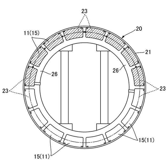 また、シールド掘進機では、後方のセグメントによる覆工体から掘進反力を得るための構造として、シールドジャッキを構成するピストンロッドの後端部に、スプレッダとして知られる当接部材を取り付け、スプレッダの当接面盤を、組み立てたセグメントによる覆工体の先端面に押し付けて支持させる構造が採用されている。そして、例えば湾曲する部分のトンネルをシールド掘進機によって掘進してゆく場合、シールド掘進機の外殻体に固定されたシールドジャッキのピストンロッドの伸長方向が、セグメントによる覆工体の先端面に対して垂直な方向から、傾くことがあるため、スプレッダは、好ましくは公知の球面継手部を介して、ピストンロッドの後端部に任意の角度で首振り可能に接続されていることで、このような方向のずれを吸収して、スプレッダの当接面盤を、覆工体の先端面に対して垂直に当接させることができるようにしている。