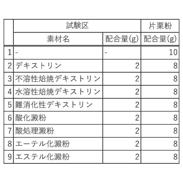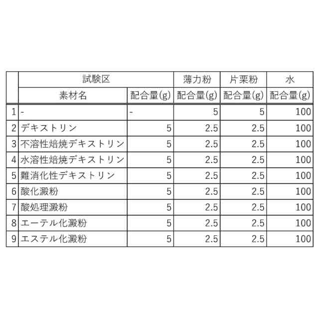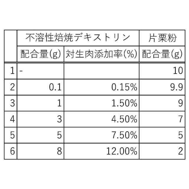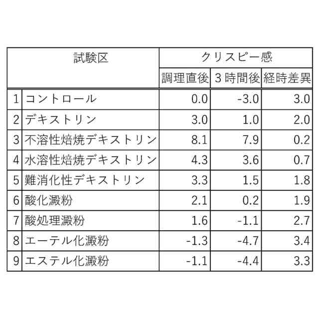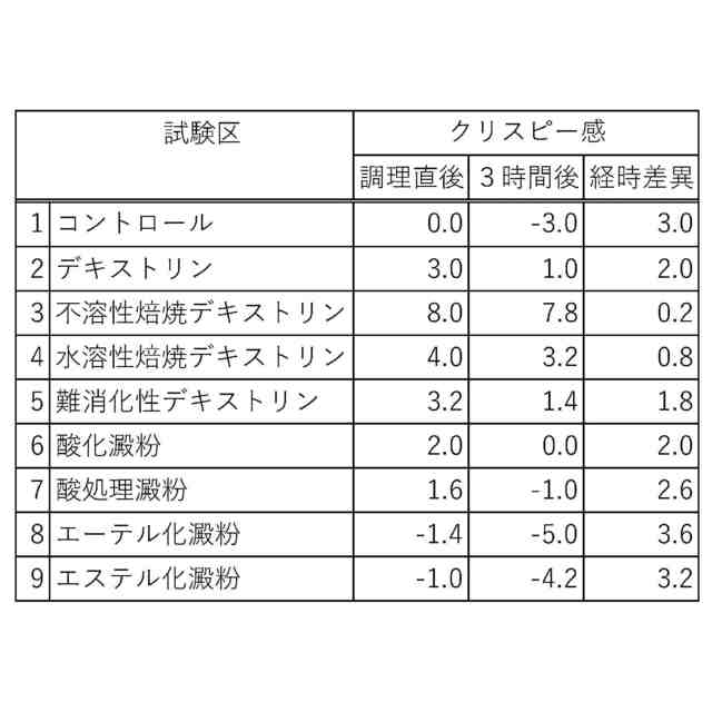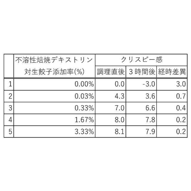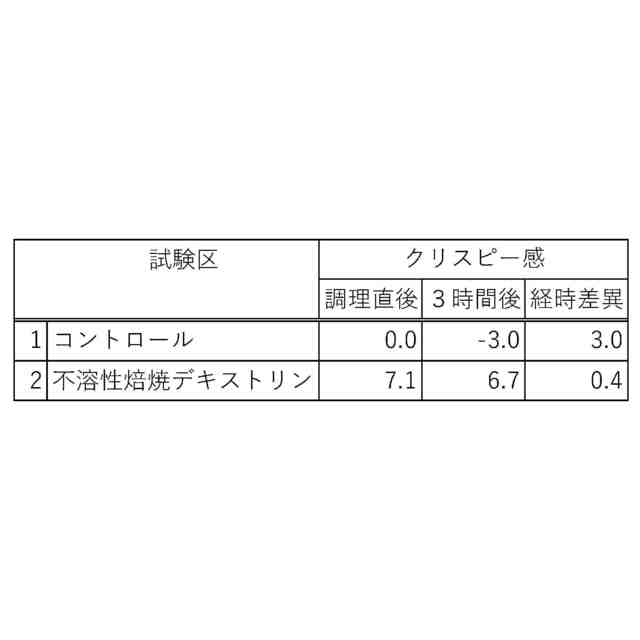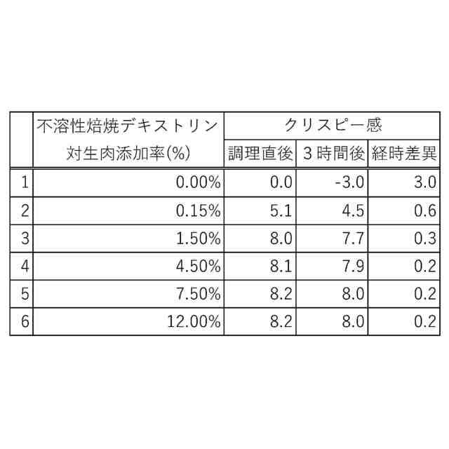 このように、加熱調理品のクリスピー食感付与技術に関しては多くの知見が報告されており、焙焼デキストリンを用いる方法も報告されているが、ドライ加熱調理において焙焼デキストリンを配合した組成物を用いることで食材周囲にクリスピー食感を有する構造物を付加するという知見はない。とりわけ、他の多糖類と比べてドライ加熱調理において焙焼デキストリンが著しく大きいクリスピー食感付与効果を有すること、更には水への溶解性が低い焙焼デキストリンによる当該効果が大きいことは、従来の加熱調理分野の常識からは示唆されるものではない。