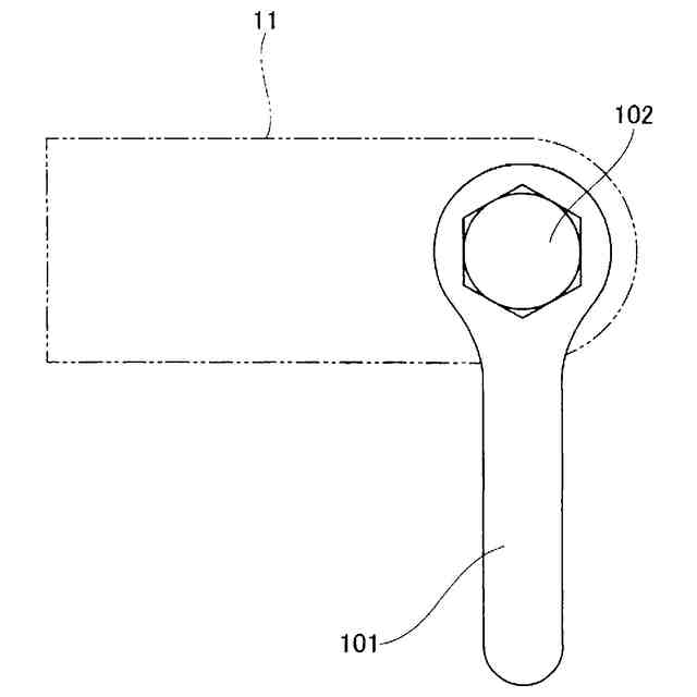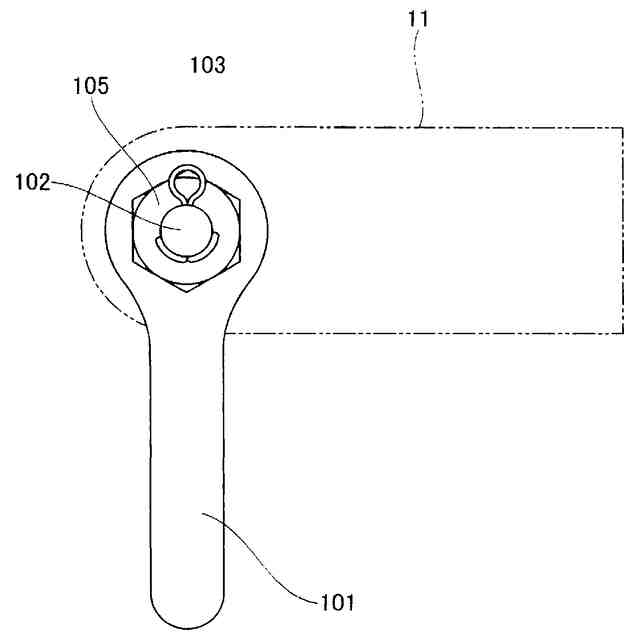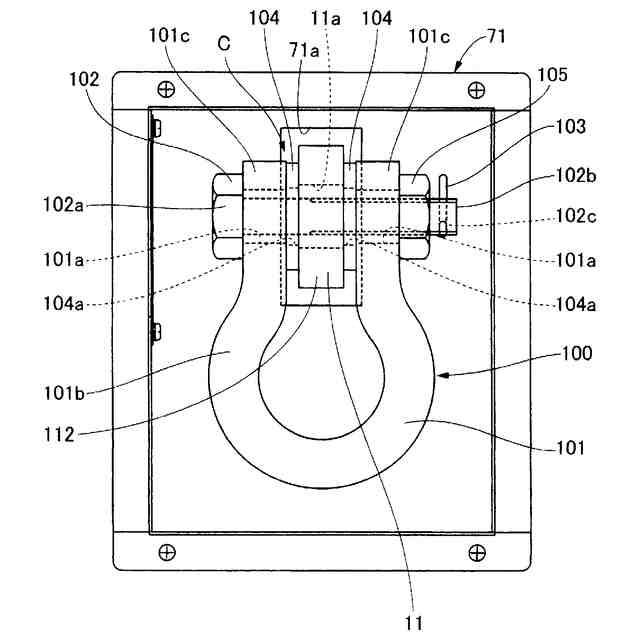 また、従来の防災車両用シャックルでは、シャックル本体は、自重によって常時取付部材から下方に吊り下げ状態となっていた。そのため、シャックル本体にロープを繋いだりフックをかけたりする作業を行う場合、シャックル本体の向きを変えてその状態を維持しつつ作業を行う必要があったので、煩雑であった。また、従来の防災車両用シャックルでは、シャックル本体にロープやフックからの荷重が加わるとシャックル本体および取付部材に高い応力が発生することにより、取付部材および防災車両用シャックルの各部を痛めやすいという問題点があった。