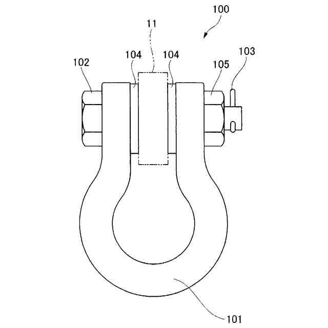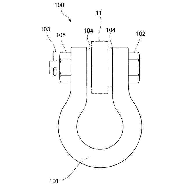 従来の防災車両用シャックルは、U字形状に形成されるとともに両端部のそれぞれに本体用孔部を有するシャックル本体と、シャックルピンとを備えている。防災車両用シャックルは、車両前部または車両後部に設けられた取付部材に対して取り付けられる。具体的には、取付部材をシャックル本体の両端部の間に配置した状態で取付部材の取付用孔部と一対の本体用孔部にシャックルピンを挿通させ、シャックル本体の開放部を遮断状態にすることにより、防災車両用シャックルは取付部材に対して取り付けられる。
