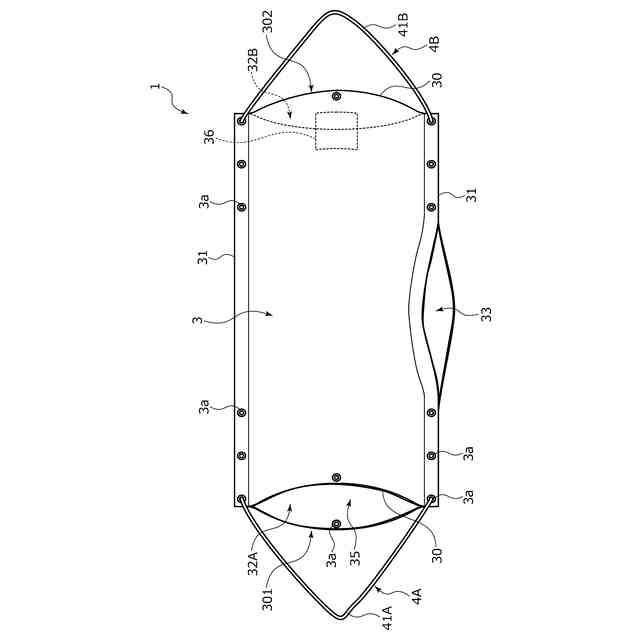 【解決手段】無人航空機Uに吊支させることで物品Tの運搬を可能にする運搬具1であって、運搬具1は内部空間35を有する袋状の本体部3を備え、本体部3の両側の端部301,302には無人航空機U側にそれぞれ接続可能な接続部4A,4Bを備え、本体部3の一方側の端部301には内部空間35に連通する開口部32Aが形成されている。