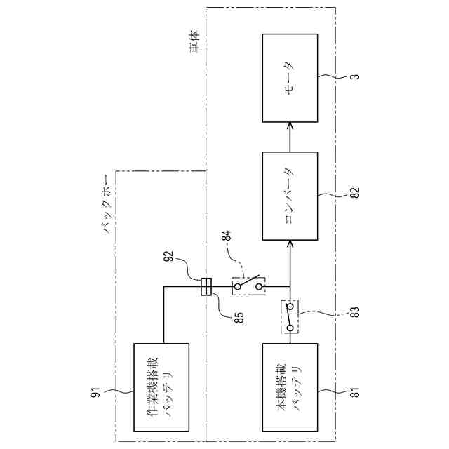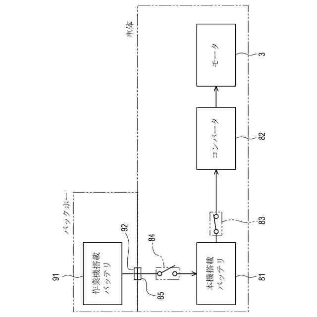 【解決手段】車体と、前記車体に装着される作業機(バックホー)と、前記作業機に設けられ、前記車体に電力を供給可能な電源装置(作業機搭載バッテリ91)と、を具備した。