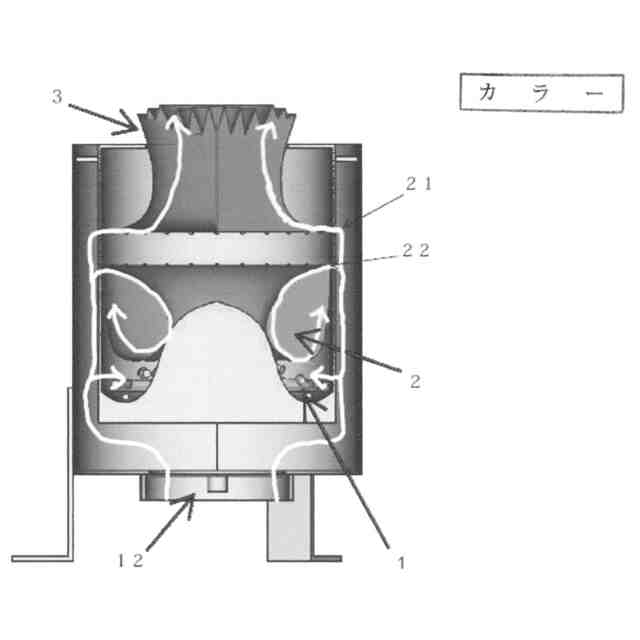 上記課題を解決する手段として、二次燃焼用の空気の吹出す方向を調整し、二次燃焼の炎が白い矢印に記したような渦を巻くようにすることで、図1二次燃焼の炎2に示されるような二次燃焼の炎の軌跡を略トーラス形状とした。つまりトーラス形状の略閉じた空間を作ることで、二次燃焼の炎自体で二次燃焼室を作り、更に該トーラス形状の穴に嵌合するようなドーム状内筒底面を設けることで、燃焼中において、内筒の中に「三つの空気の層」を得ることが可能になった。言い換えると、物理的な仕切りのない一次燃焼、二次燃焼、三次燃焼の生じる三つの空間を設けた。
