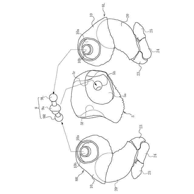 図1及び図2に示す玩具1は、形象物として犬を模した玩具である。図1においては、玩具1は、載置部50上に前後脚部7,8を伸ばした起立形態として置かれ、図2においては、後脚部8を曲げた座位形態として載置部50上に置かれている。玩具1は、犬の頭部3、胴部4、腰部5、及び尾部6が連続して接続された構成となっている。例えば胴部4は、複数の胴部パーツ4aからなり、また、尾部6も複数の尾部パーツ6aが連結された構成となっている。そして、頭部3から尾部6までの各パーツは、その詳細については省略するが、パーツ間の連結部位において球形の連結構造を有するピボット構造(図3参照)等により接続されて隣り合うパーツ同士が若干動くように構成されている。すなわち、隣り合うパーツ同士が位置ずれ可能になっていることで、頭部3から尾部6までの間の形状を変えることができ、玩具1の姿勢の変更を可能にしている。