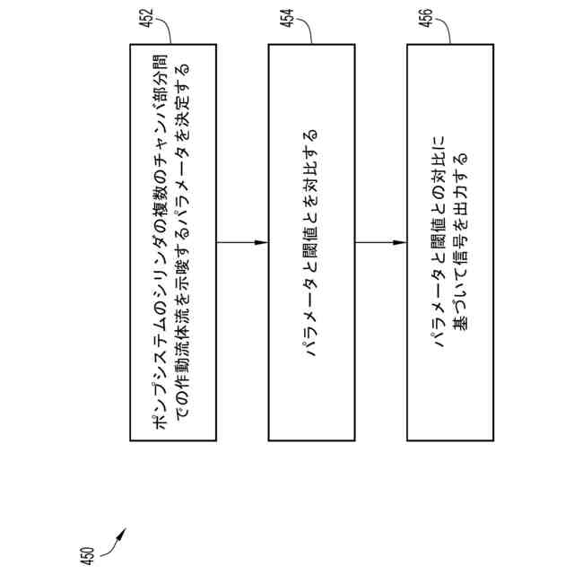 さらなる実施形態では、非一時的コンピュータ可読媒体は、1つ以上の処理装置によって実行されるときに、前記1つ以上の処理装置に、ポンプシステムのセンサからパラメータを受け取らせ、前記パラメータと閾値とを対比させ、かつ、前記パラメータと前記閾値との前記対比に基づいて信号を出力させるように構成される命令を有する。当該ポンプシステムは、シリンダ内部で第1チャンバ部分及び第2チャンバ部分を画定するように前記シリンダ内部に設けられるピストンを備える。前記ピストンは、前記シリンダ内部において第1方向に運動することで作動流体を前記第1チャンバ部分へ引き入れるように構成され、前記ピストンは、前記シリンダ内部において第2方向に運動することで前記第1チャンバ部分内において前記作動流体を加圧するように構成され、当該ポンプシステムの導管システムは、前記第2チャンバ部分から放出される流体を受けるように構成され、前記パラメータは、前記導管システムを通る流体流に関連付けられ、かつ、前記第1チャンバ部分と前記第2チャンバ部分との間での作動流体流を示唆する。