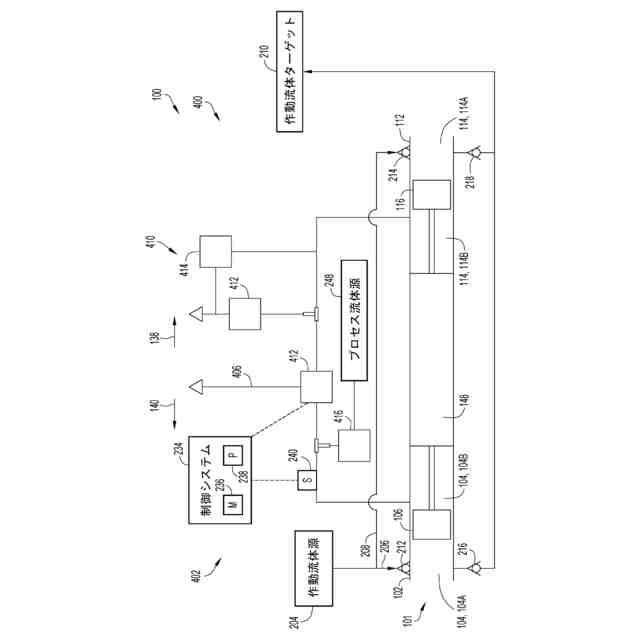 他の実施形態では、導管システムは、第1脚部と第2脚部を有する。前記第1脚部は、第1シリンダの第1チャンバ部分と流体結合するように構成される。前記第1シリンダは、前記第1チャンバ部分と第2チャンバ部分を画定する第1ピストンを有する。前記第2脚部は、第2シリンダの第3チャンバ部分と流体結合するように構成される。前記第2シリンダは、前記第3チャンバ部分と第4チャンバ部分を画定する第2ピストンを有する。前記第1シリンダ内で前記第1ピストンが運動することで、前記第2チャンバ部分内の作動流体が加圧され、前記第2シリンダ内で前記第2ピストンが運動することで、前記第4チャンバ部分内の作動流体が加圧され、かつ、前記第1脚部と前記第2脚部は、前記第1チャンバ部分と前記第3チャンバ部分を相互に流体結合する。