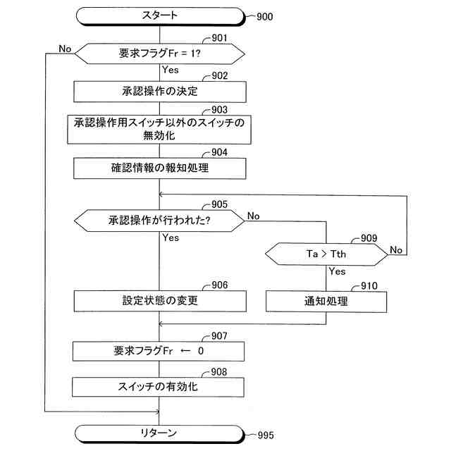 前記音声認識処理を介して前記設定変更要求が行われたと判定した場合(ステップ803:Yes)、前記設定変更要求の内容に関する情報と、前記設定変更要求に対して予め定められた承認操作に関する情報とを含む確認情報を前記報知装置に報知させ(ステップ904)、