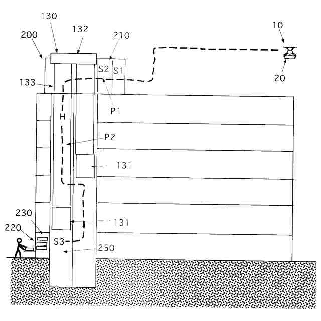 発明者は、飛行経路に沿って存在する建築物に荷物を一時保管するために、建築物または駐車装置にドローンが出入りするための副構造を考案した。
