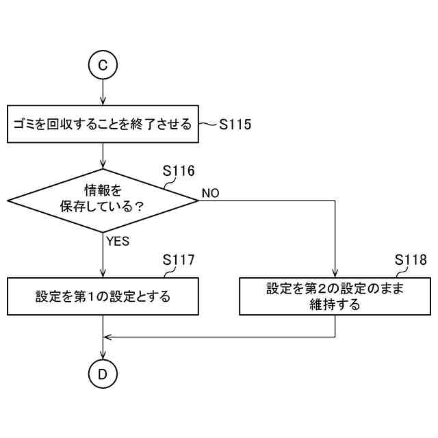 前記操作を前記動作に反映させず前記回収部に前記ゴミを回収することを継続させ、前記回収部に前記ゴミを回収することを終了させた後に前記操作を前記動作に反映させることは、前記設定を前記第1の設定に切り替えるべきことを示す情報を保存し前記回収部に前記ゴミを回収することを継続させ、前記回収部に前記ゴミを回収することを終了させた後に前記情報にしたがって前記設定を前記第1の設定へ切り替えることを含む