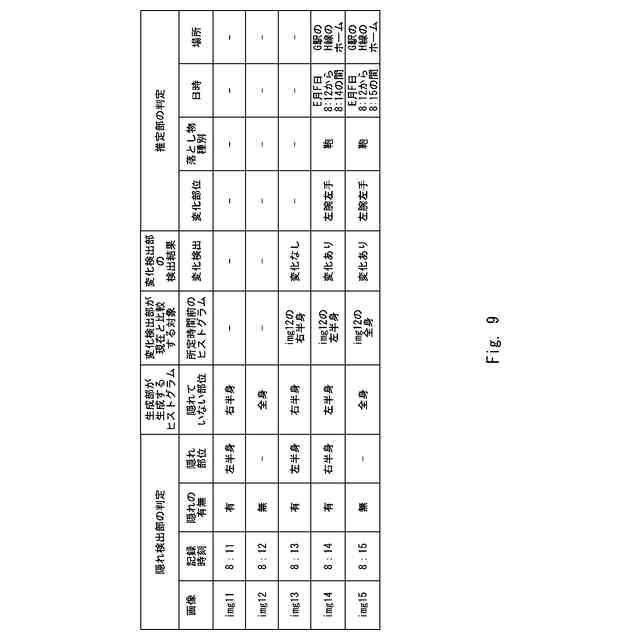 ここで、対象人物が監視カメラ等で撮影された領域内で所持物を紛失した場合、対象人物の全身が含まれる複数の撮影画像の集合の中から、所持物の有無の変化が検出された撮影画像の組を特定し、特定した撮影画像の組が撮影された時間帯及び場所の範囲で対象人物が所持物を紛失したと推定できる。しかしながら、撮影画像には、対象人物の全身が含まれない画像も多いため、対象人物の全身が含まれる撮影画像だけから所持物の有無の変化を検出する場合、所持物を紛失したと推定される時間帯及び場所の範囲が広くなり得る。そのため、対象人物が所持物を紛失した時間帯及び場所の推定精度が不十分になるという課題がある。
