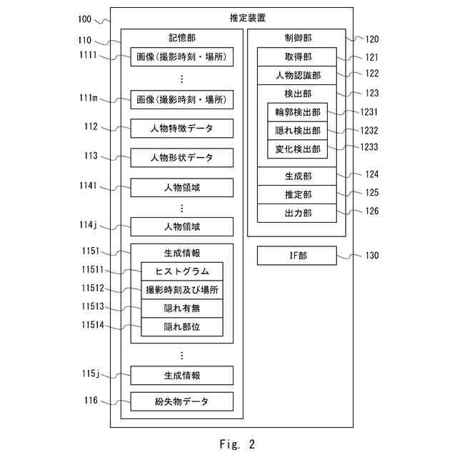 【解決手段】推定装置(100)は、撮影時刻が異なる3以上の画像のそれぞれから、対象人物を認識する人物認識部(122)と、認識された対象人物に対応する輪郭内を人物領域とした画像のうちの第1の画像組における各画像の間で輪郭内における画素値の分布の変化量を検出する検出部(123)と、変化量が閾値以上である場合、第1の画像組の各画像が撮影された時間帯及び場所の範囲において対象人物が所持物を紛失したと推定する推定部(125)と、を備え、検出部(123)は、第1の画像組のうち少なくとも一方の第1画像における第1人物領域から対象人物の向きに応じた輪郭に身体部位の欠けである隠れ部位が検出される場合、他方の第2画像における第2人物領域として、隠れ部位を除外した輪郭内の領域を検出する。