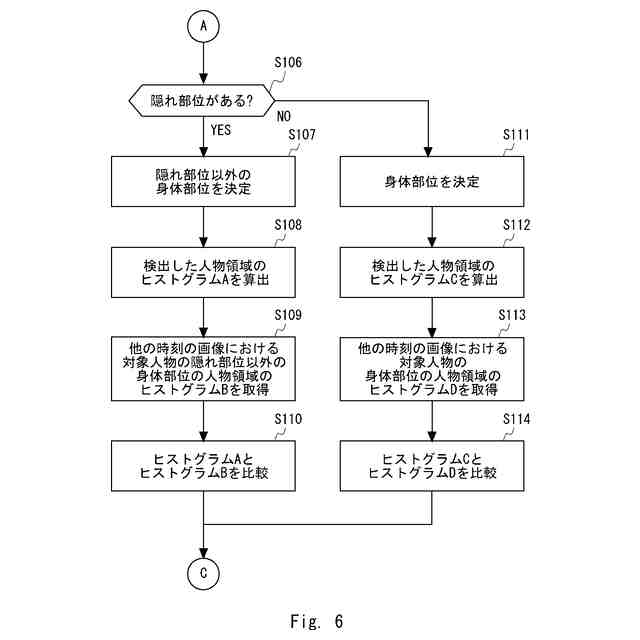 前記対象人物が認識された画像群のうち前記第1画像を除いた第2の画像組における各画像から、前記対象人物に対応する輪郭内であって前記隠れ部位を含む人物領域を検出し、前記第2の画像組における各画像の間で、前記隠れ部位を含む人物領域の輪郭内における画素値の分布の変化量を検出する