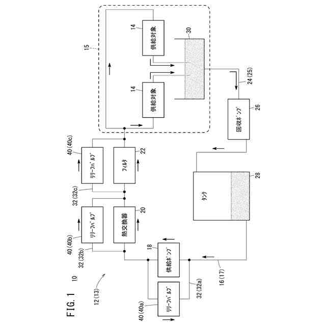 液体供給装置13は、供給ライン16と、供給ポンプ18と、熱交換器20と、フィルタ22と、回収ライン24と、回収ポンプ26と、タンク28とを備える。