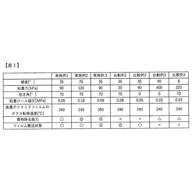 特許文献5の方法はポリイミドフィルムに衝撃を与えないという点で好ましい方法である。一般的に粘着力の高い粘着ロールを使用することで、高い異物除去能力を得ることができる。しかし粘着力を高めると粘着ロールとポリイミドフィルム間で剥離不良が発生するため、搬送張力を高めるとポリイミドフィルムにシワが発生してしまいフィルム搬送性が悪化する。そのため、異物除去能力とフィルム搬送性の両立が難しいという問題がある。表層に加工性の良いガラス転移温度の低い熱可塑性のポリイミドを使用している場合、オーブン内部で付着した異物がポリイミドフィルムに埋まってしまう。そのため異物除去に高い粘着力が求められ、前述の異物除去能力とフィルム搬送性の両立が特に難しい。