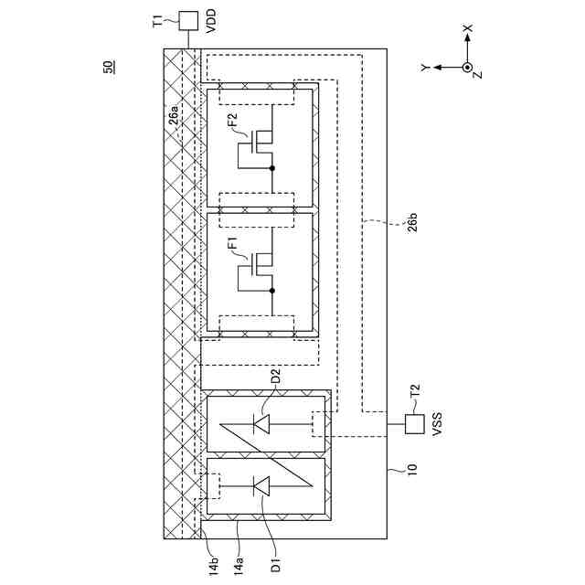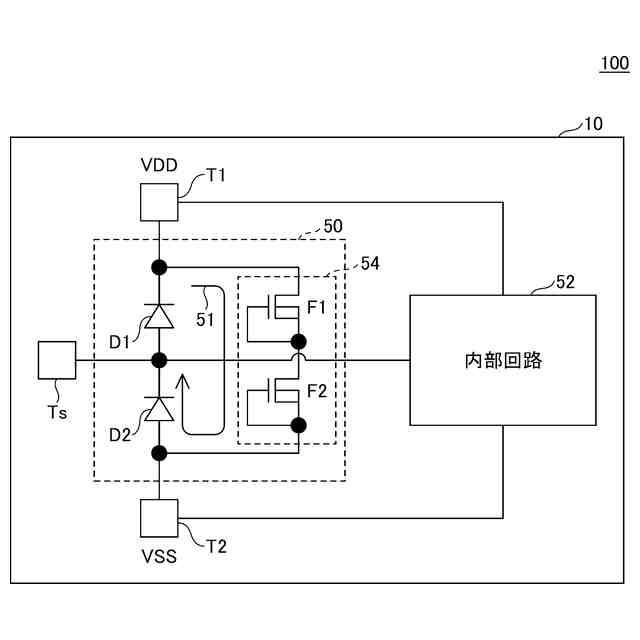 図1は、第1実施形態に係る半導体装置のブロック図である。図1に示すように、第1実施形態に係る半導体装置100は、半導体基板10、ESD保護回路50、内部回路52、入出力端子Ts、電源端子T1およびT2を備えている。ESD保護回路50、内部回路52、入出力端子Ts、電源端子T1およびT2は、半導体基板10上に設けられている。