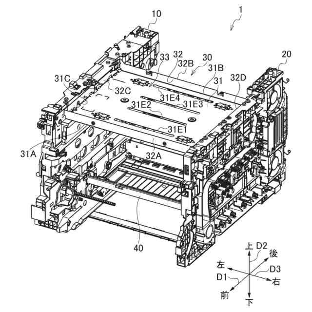 【解決手段】プリンタ1は、本体筐体の相対向する側壁を形成する一対の本体フレーム10,20と、一対の本体フレーム10,20のうちの一方の左側本体フレーム10と他方の右側本体フレーム20との間に懸架されたスキャナフレーム30であって、感光体ドラムを露光するための露光装置を設置するスキャナフレーム30と、を備えている。そして、左側壁面プレート32C、第1補助プレート32AA1及び第3補助プレート32BA1が、左側本体フレーム10にねじ止めされ、右側壁面プレート32D、第2補助プレート32AB1及び第4補助プレート32BB1が、右側本体フレーム20にねじ止めされることで、スキャナフレーム30は一対の本体フレーム10,20の間に懸架される。