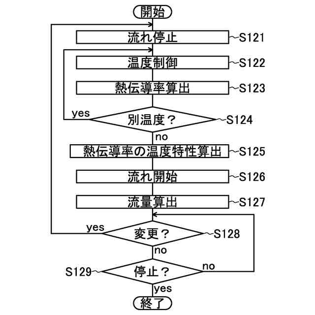【解決手段】第5回路111が、第3回路109が求めた温度差と、第4回路110が求めた消費電力と、温度測定値を測定した拡散温度測定部107a,107b,107cと温調部102との距離と、配管の断面積とから、第3回路109が求めた温度差の各々について流体の熱伝導率を求める。第6回路112が、第5回路111により求められた各々の熱伝導率より流体の熱伝導率の温度特性を求める。第7回路113が、第6回路112が求めた流体の熱伝導率の温度特性で、センサ値を補正した補正値を求める。