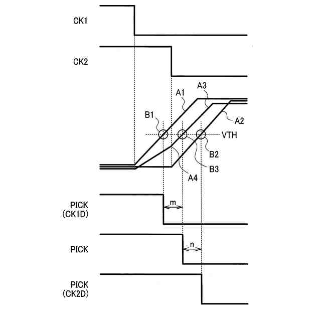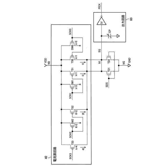 図1に本実施形態の位相補間回路30の構成例を示す。位相補間回路30は、クロック信号CK1とクロック信号CK2を位相補間した補間クロック信号PICKを生成する。クロック信号CK1は第1クロック信号である。クロック信号CK2は、第2クロック信号であり、クロック信号CK1とは位相が異なるクロック信号である。例えば位相補間回路30は、クロック信号CK1に対応する信号の位相と、クロック信号CK2に対応する信号の位相の間の中間位相信号を、補間クロック信号PICKとして生成する。クロック信号CK1に対応する信号は、例えばクロック信号CK1の遅延信号であり、例えば回路遅延によりクロック信号CK1が信号遅延した信号である。同様にクロック信号CK2に対応する信号は、例えばクロック信号CK2の遅延信号であり、例えば回路遅延によりクロック信号CK2が信号遅延した信号である。クロック信号CK1、CK2の遅延信号は、クロック信号CK1、CK2の立ち下がりエッジ又は立ち上がりエッジであるエッジが遅延した信号である。クロック信号CK1の遅延信号におけるエッジの遅延時間と、クロック信号CK2の遅延信号におけるエッジの遅延時間は例えば同等の遅延時間である。例えばクロック信号CK1、クロック信号CK2は、同様の構成の回路により信号遅延されて、クロック信号CK1に対応する信号、クロック信号CK2に対応する信号になる。