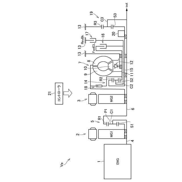 図1には、本発明の実施形態における電動車両の一例を模式的に示してある。図1に示す電動車両(以下、単に車両と記す。)Veは、駆動力源としてのエンジン(ENG)1と二つのモータ2,3とを備えたハイブリッド車両である。エンジン1は、従来の車両に設けられたエンジンと同様に構成することができ、空気と燃料との混合気を燃焼することにより動力を発生するように構成され、所定の回転数以上の回転数で自律回転することができるように構成されている。なお、エンジン1が、本発明の実施形態における「他の駆動力源」に相当する。