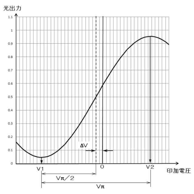 従来、アンテナ一体型の光電界センサヘッドは、主として、広帯域で高感度特性の得やすさや作製の容易さ等を考慮して、ニオブ酸リチウム結晶基板上に分岐干渉型光変調器を形成し、その変調電極と一体化した電極アンテナを設けて構成されている。分岐干渉型光変調器を光電界センサの光変調器として使用する場合、印加電界に対する直線性が得られる範囲を大きくするためには、印加電圧が0の場合の動作点は、干渉により光出力が最小、最大となる印加電圧の中間点に近いほど望ましい。通常は、アンテナ電極に導電体を接触させて電源により可変電圧を印加し、光出力の印加電圧特性を求めて、上記の動作点を求めている。