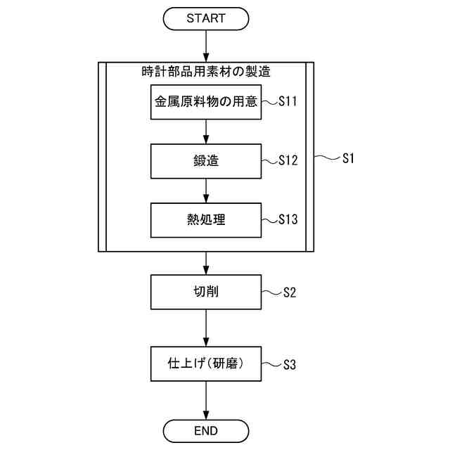 特許文献1には、時計用ケース等の時計用部品を製造する方法として、Feを主成分とするインゴットを鍛造により略円柱状の金属組成物とし、溶体化処理を施した後、切削、研削、研磨等の機械加工(荒加工)を施すことにより、腕時計用ケースに対応する形状に加工し、その後、時効処理を施した後、バフ研磨、梨地加工、スジ目加工を施し、鏡面部と、梨地部と、スジ目部とを、所定のパターンに形成する仕上げ加工を行うことにより、腕時計用ケースを製造する方法が開示されている。