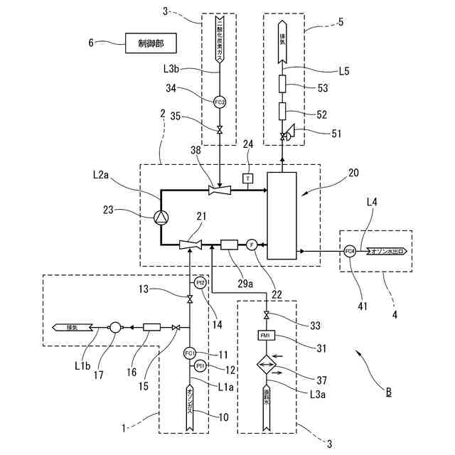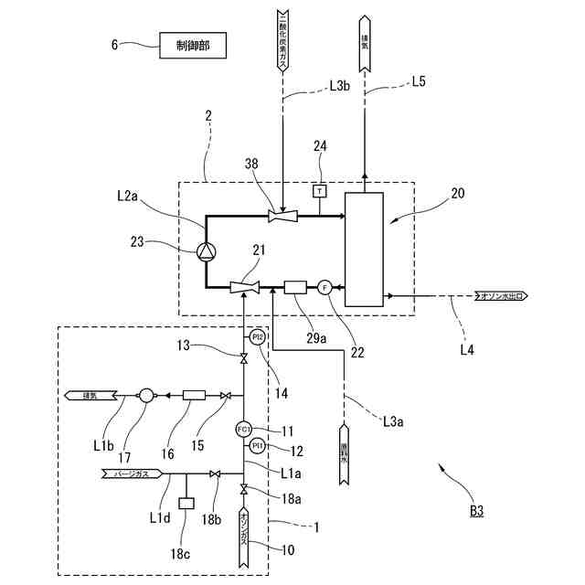 特許文献5では、オゾンガス生成装置(特許文献5では、酸素ガスを原料とする装置)のオゾンガスと原料水とを気液混合器により混合してオゾン水を生成するものであって、当該原料水によって低濃度化し過ぎたオゾン水(特許文献5では符号34で示すタンク内のオゾン水)を当該気液混合器に通過させる構成により、オゾン水を高濃度化することが開示されている。