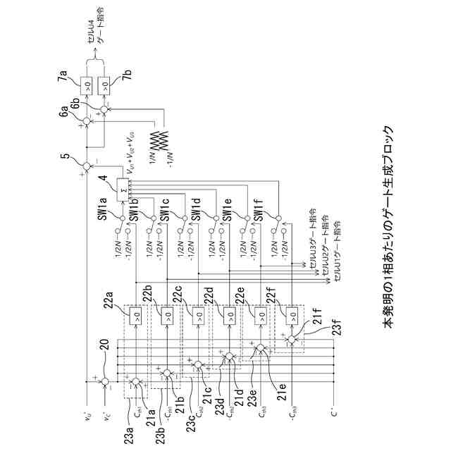 の差分により出力電圧指令値を求め(減算器5)、その指令値とキャリア信号の比較によって高周波駆動セル(U4)のゲート指令を生成するゲート指令生成部であって、前記閾値を、高周波駆動セルの直流電圧と複数のセルが出力する有効電力に応じて変化させるための閾値補正値C