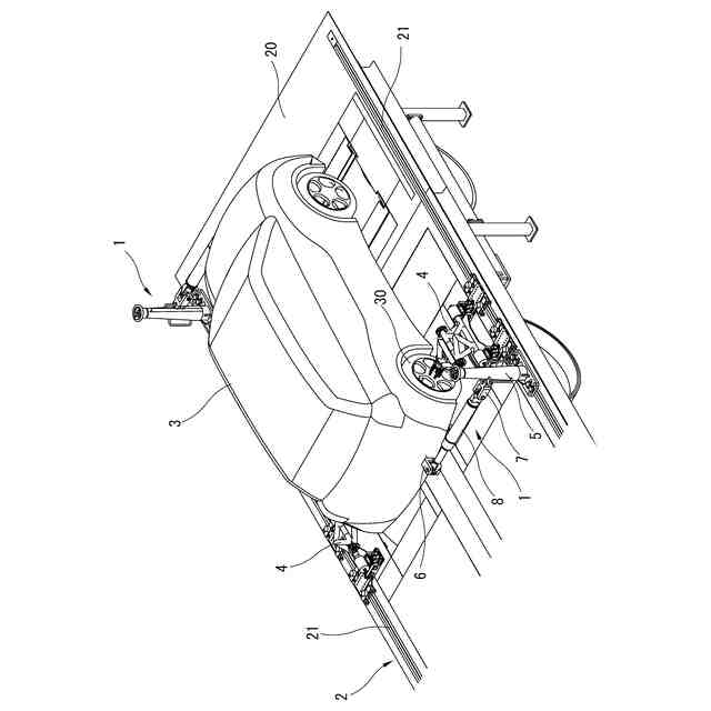 また、特許文献2には車両固定装置の連結用のアダプタを試験車両の底面の補強用の梁やサイドシル等に設けられたアダプタ挿入部に挿入することで試験車両の前後方向、左右方向(ヨーイング方向)、上下方向の動きを固定する車両固定装置が開示されている。