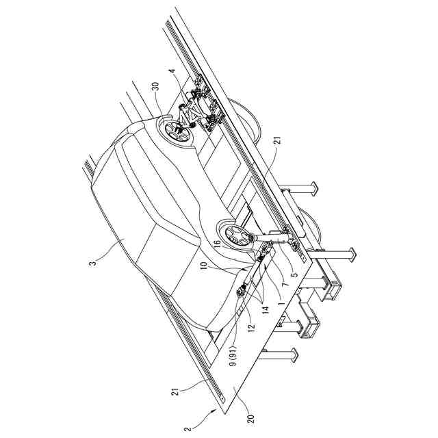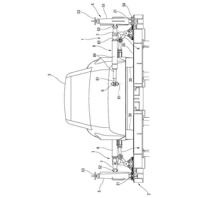 そして、試験車両の回転部(タイヤやハブナット)を固定した際、安全上の観点から車両に取り付いている牽引フックとワイヤーロープやチェーン等によりピット上へ結合することで張力管理や取付け角度調整などが必要となりセッティングや調整の作業性が悪い。