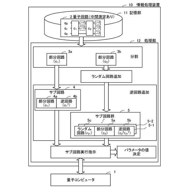 【解決手段】情報処理装置10は、量子回路2を複数の部分回路3a,3bに分割する。情報処理装置10は、複数の部分回路3a,3bそれぞれについて、部分回路の後に、部分回路の演算と逆の演算を量子コンピュータ1に実行させる逆回路を追加したサブ回路4,5-1,5-2,・・・を生成する。情報処理装置10は、量子コンピュータ1に量子回路2を実行させるために設定されるパラメータの複数の候補値それぞれについて、候補値をパラメータに設定して、サブ回路4,5-1,5-2,・・・を量子コンピュータ1に複数回ずつ実行させる。情報処理装置10は、サブ回路4,5-1,5-2,・・・を実行したときの入力状態と出力状態との比較結果に基づいて、複数の候補値のなかから、量子回路2の実行においてパラメータに設定する値を決定する。