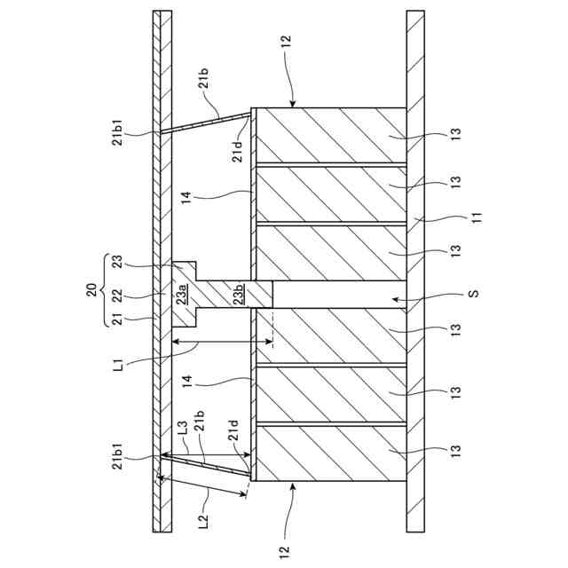 前記土台(23)の挿入方向の長さ(L1)は、前記挿入方向に交差する方向視で前記土台(23)を挟む前記延出部(21b)が伸びきった状態における前記延出部(21b)の前記本体部(21a)との接続部(21b1)と前記バスバー(14)または前記セル(13)との距離(L3)よりも長いことを特徴とする、