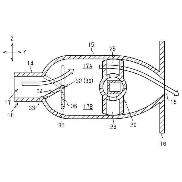 また、フィンが第2通路部に位置しているときには、第2通路部を流れる空調用空気がフィンを通過する際にフィンに沿って流れるようになる。ここで、第2通路部に位置しているときのフィンの傾斜方向は、第1通路部に位置しているときのフィンの傾斜方向とは逆方向となる。これにより、吹出口を通じて吹き出される空調用空気の風向が第1方向の他側に変更される。