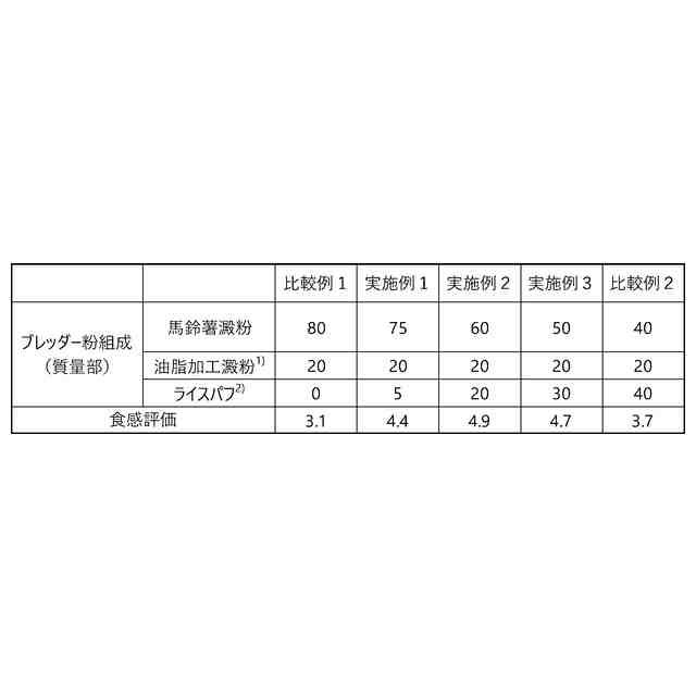 本発明者らは上記課題に鑑み検討を重ね、米粉をパフ化して粉砕した粉砕物及び油脂加工澱粉を含有し、これらの含有量が特定の範囲にあるブレッダー粉は、調理後時間が経ってもボリューム感があり、ヒキが少なく、かつサクミがある食感を維持する揚げ物の衣を調製できることを見出した。本発明はこれらの知見に基づき完成されるに至ったものである。