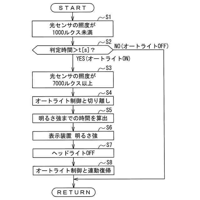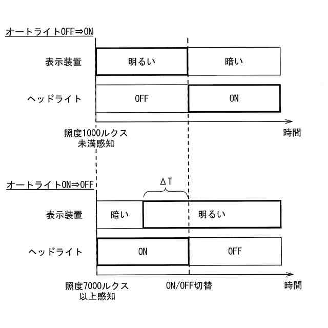この保安基準では、車両の周囲が暗い状態から7000ルクス以上の明るい状態に移行した場合、最短でも5秒経過しないとヘッドライトは消灯しない。このため、ヘッドライトの点灯と消灯に連動しているナビゲーション装置やインストルメントパネル等の表示画面の輝度も、最短でも5秒経過しないと高輝度状態に切り替わらない。