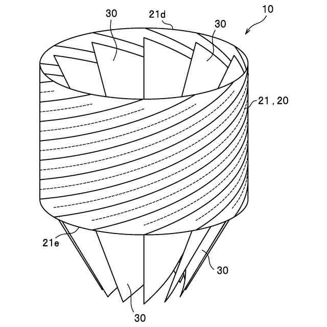 ここで、螺旋形状とは、円筒の内周面の周方向に回りながら、上下方向に角度を有するように軌跡を描く形状のことを意味する。