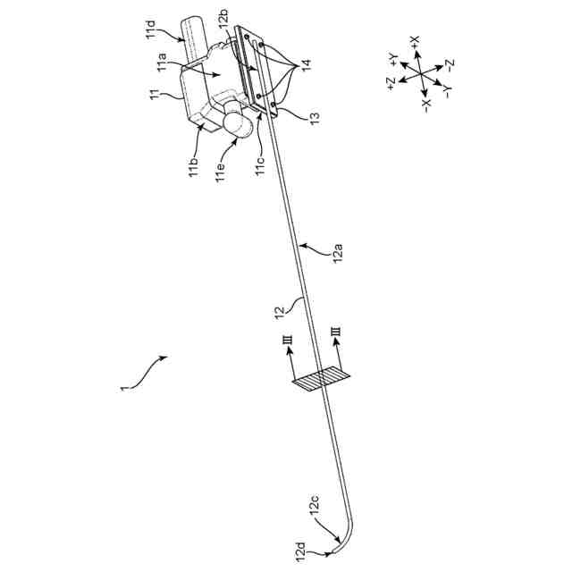 前記ロッドは、長手方向における前記基端部と前記先端部との間の中間部が直線状に延びるとともに、前記先端部は、前記中間部が延びる方向に対して交差する方向に弧状に曲がっており、
