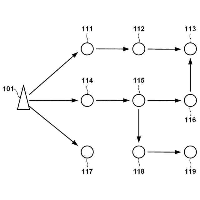 図1に、本実施形態に係る無線通信システムの構成例を示す。この無線通信システムは、無線レピータを用いたメッシュネットワークであり、基地局装置101と、無線レピータ111~無線レピータ119とを含んで構成される。基地局装置101は、例えば、第5世代(5G)のgNodeBや、それ以降の世代のセルラ通信規格に準拠した基地局機能を有するノードでありうる。無線レピータ111~無線レピータ119は、例えば、基地局装置101から送信された信号を広い範囲に到達させるように分散配置される。無線レピータ111~無線レピータ119は、特定の方向から到来した電波を増幅して、その到来方向と異なる方向へ出力するように構成される。例えば、無線レピータ111は、基地局装置101の方向へ向けられた受信ビームを用いて基地局装置101からの信号を受信し、その基地局装置101の方向とは異なる方向へ増幅した信号を出力するように構成される。なお、無線レピータ111は、基地局装置101の方向に向けられた受信ビームにおいて、自装置が中継する信号が所定レベル以上で受信されないような送信ビームを形成して、増幅した信号を出力する。そして、無線レピータ112は、無線レピータ111の方向に受信ビームを向けることにより、無線レピータ111から出力された信号を所定の無線品質以上の品質で受信することができる。そして、無線レピータ112は、受信した信号を増幅し、その無線レピータ111の方向とは異なる方向へ増幅した信号を出力するように構成される。一方で、無線レピータ114や無線レピータ115も、無線レピータ111の方向に受信ビームを向けることにより、無線レピータ111から出力された信号を所定の無線品質以上の品質で受信することができることが想定される。しかしながら、無線レピータ114及び無線レピータ115は、その受信ビームを、それぞれ基地局装置101及び無線レピータ114の方向に向けることにより、無線レピータ111から出力された信号を十分な電力で受信することはない。そして、無線レピータ114及び無線レピータ115は、それぞれ、基地局装置101及び無線レピータ114からの信号を十分な電力で受信することができる。このようにして、図1の矢印で表現されるように、中継通信経路の各区間が設定される。