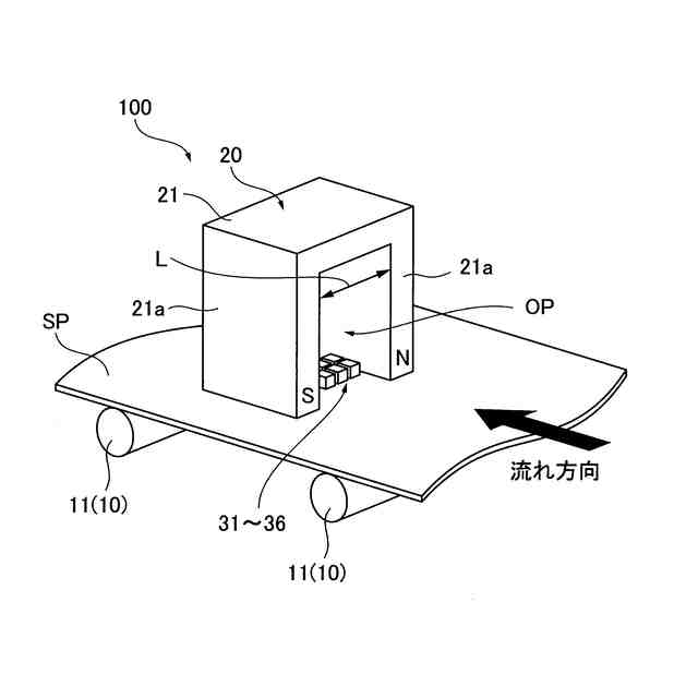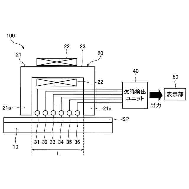 欠陥検査装置は、一般的には検査対象物である薄鋼板に磁界をかける磁極を薄鋼板の搬送方向に配置(以下、L方向励磁ともいう)されている。L方向励磁では、薄鋼板をその長手方向に磁化させて、薄鋼板から漏洩した磁束を検出する検出器がその幅方向に複数配置される。