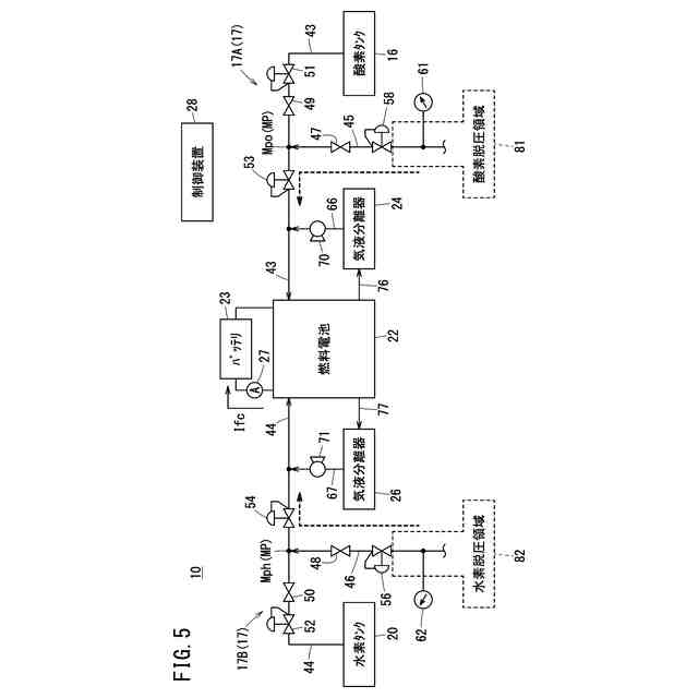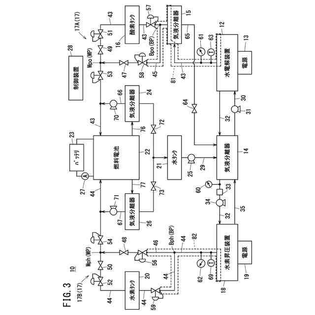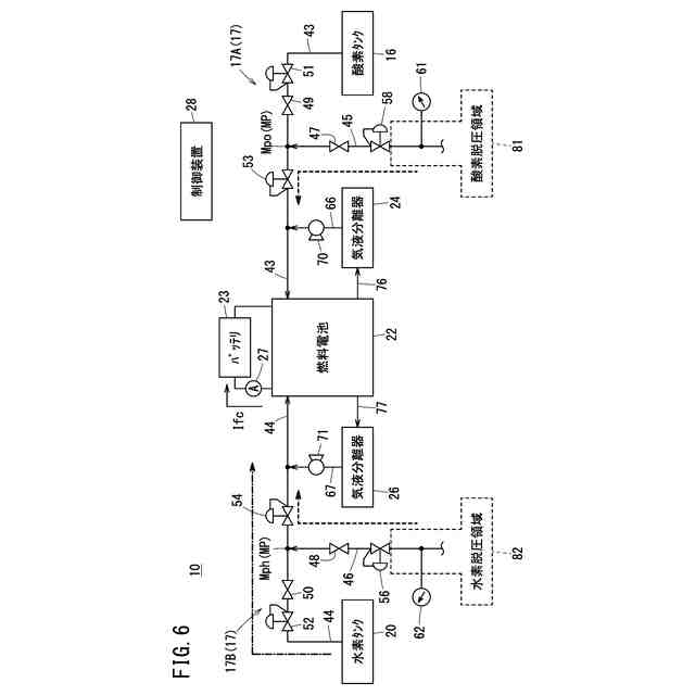 【解決手段】水素昇圧装置と水電解装置の脱圧処理を実行する際に、開閉弁(47、48、49、50)を開いた状態にし、且つ供給用減圧弁(51、52)の設定圧力をバイパス用減圧弁(56、58)の設定圧力よりも低い値に調整する。これにより、ガス脱圧領域(81、82)に残存するガスを、バイパス用減圧弁(56、58)を介して燃料電池(22)に供給し得る。
