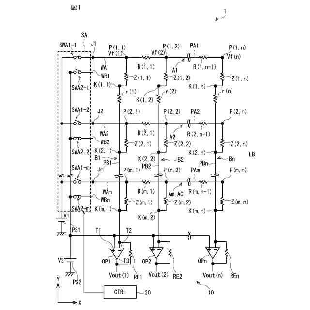 複数の第1配線と、前記複数の第1配線と異なる方向にそれぞれが延在する複数の第2配線と、前記複数の第1配線のうちの1つと前記複数の第2配線のうちの1つとの双方にそれぞれが接続される複数のインピーダンス素子とを有する素子アレイ回路と、