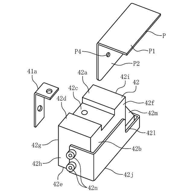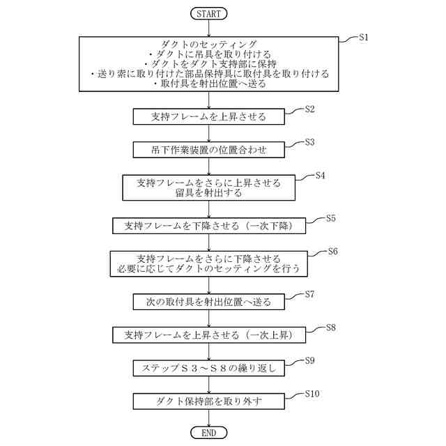 本発明の装置は、上下方向に昇降する前記動作部としての支持フレームを備えた前記動作装置としての昇降部と、前記支持フレームに支持され、対象物に対し留具を射出する留具射出部と、前記留具射出部の留具の射出位置を目標位置に合わせるための位置合わせ部とを備え、前記位置確認機構としての光照射装置は、上方から見て前記支持フレームの外郭にあたる位置に取り付けられ、上方へレーザ光を照射するよう構成することができる。