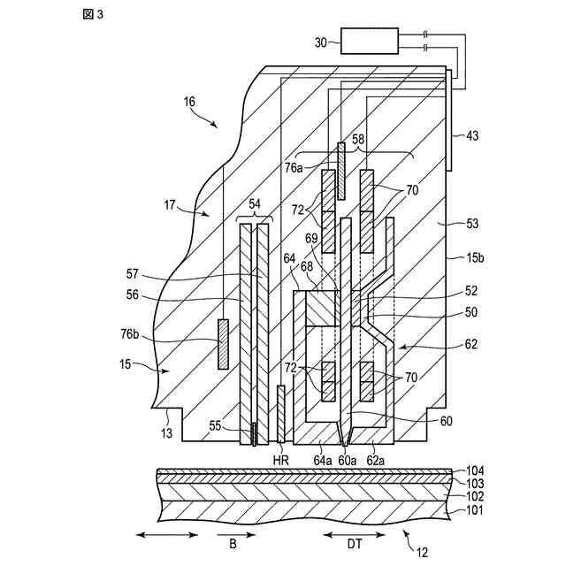 図5は、熱アクチュエータにより記録ヘッド部分を突出させた状態の磁気ヘッドおよび前記ヘッド部を模式的に示す側面図。